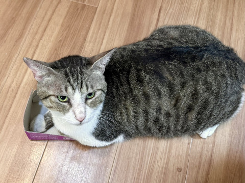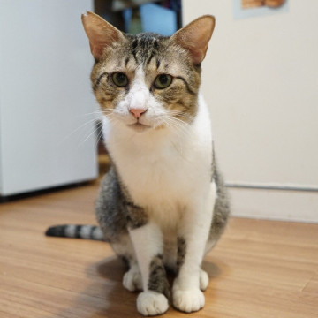 ◯推定6歳くらい(2025年9月時点)のキジ白ハチワレ男子です。
