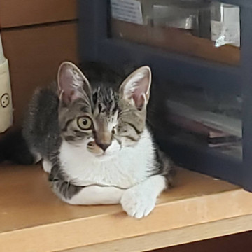 藤沢市内の住宅地で一斉保護した中の一匹です。子猫の数があまりにも多く、しおりちゃんが保護できた時には風邪が悪化していました。手当の甲斐あって元気になりましたが、片目を失いました。