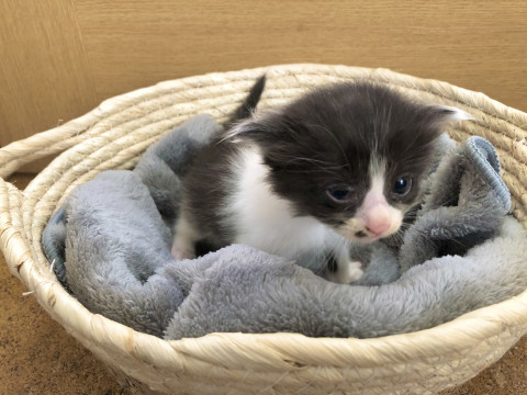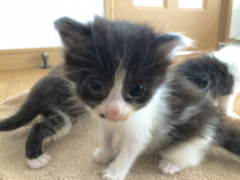 生後およそ3週間、ふわふわ毛のハチワレ子猫です。母猫が長毛なので長毛になる可能性が高いです。とても好奇心旺盛、よちよち歩きでお部屋探検が日課です。