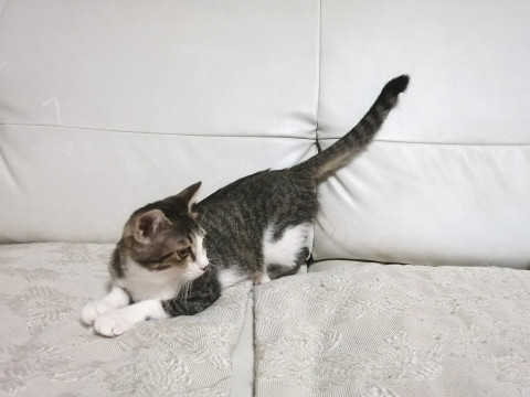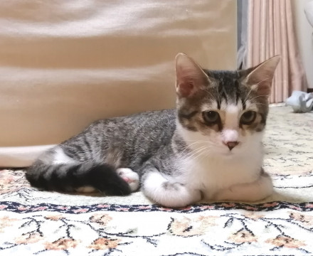 キジ白でとても愛らしいお顔です。尻尾は真っすぐでとても長いです❗