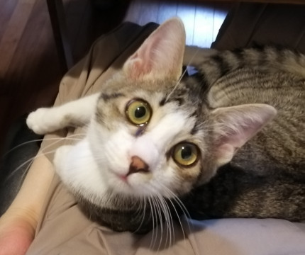 私が腰掛けると、遠くからニャーッ、と言いながら飛び乗ってくる可愛らしい子です。