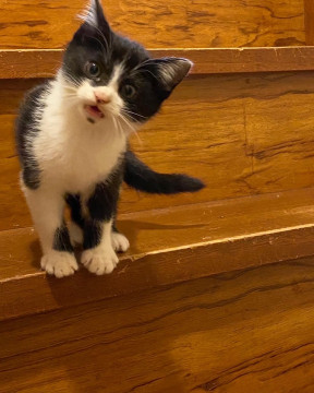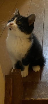 寂しがりやさんで明け方になると保護主の布団の中に入れてもらっています。甘えん坊で活発な子です。あごの下の模様がチャームポイントです。