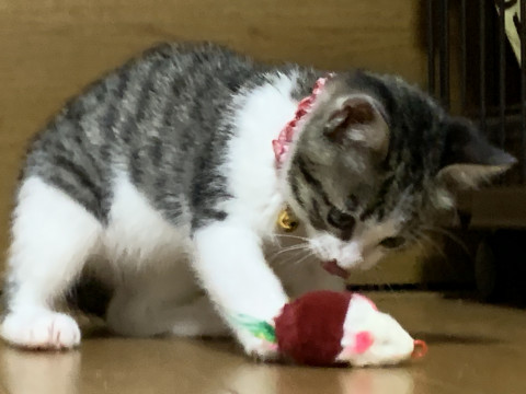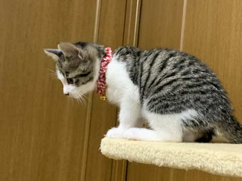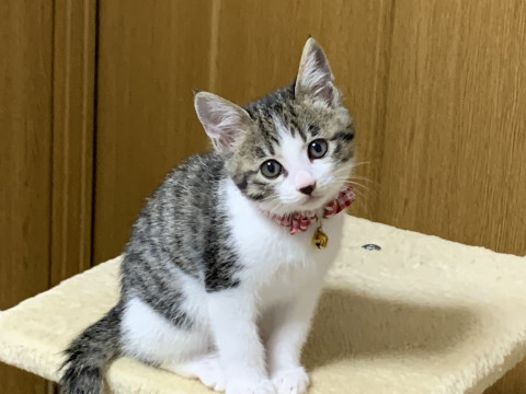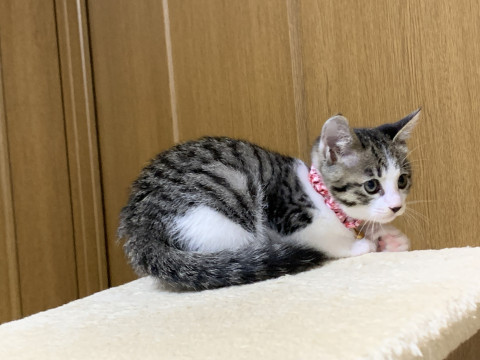 丸顔の愛らしい顔の女の子です。小柄ですが子猫らしく元気に走り回り仲良く過ごしています。成猫とも友好的に過ごしています。
