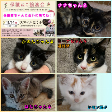 11月14日(日)に防府市の『スマイルほうふ』で開催予定の保護ねこ譲渡会に参加予定です。詳しくは譲渡会情報をご覧ください。可愛い子達に会いに来てくださいね。