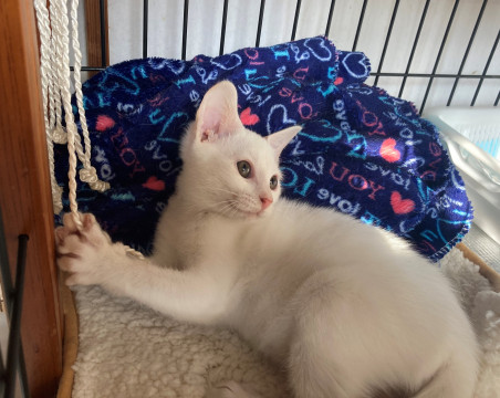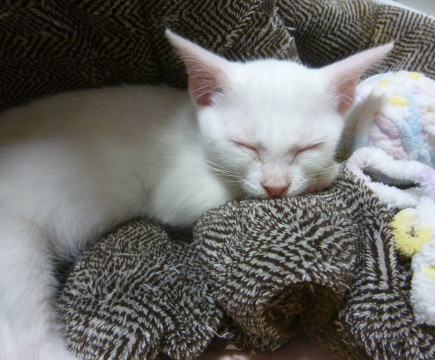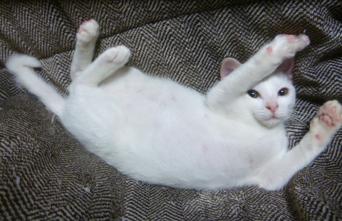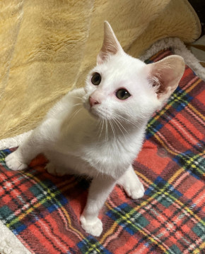 真っ白の女の子。しっぽの先がちょこっと曲がっているのがチャームポイント。