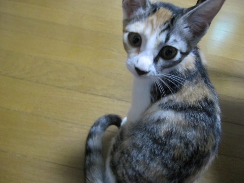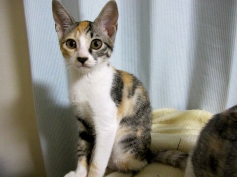 きじとらと茶とらと白のパッチワークのような柄で、手足もしっぽも体つきもすらりとしています。あまり鳴きませんし、鳴いても声が小さいです。とても人なつこくごろごろ言い出すと止まりません。かなりやんちゃで、いつも他の猫達と運動会をしています。