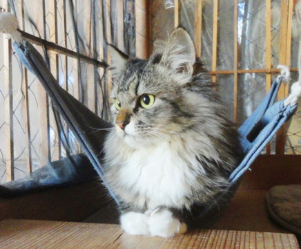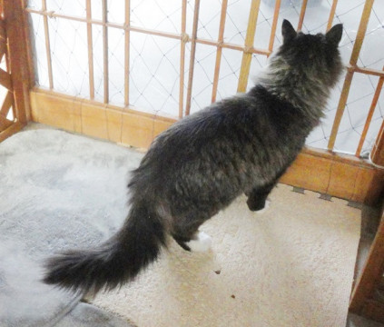 現在は、ガレージにある猫部屋で、先輩猫3匹と暮らしています。猫社会のマナーは身につけており、先輩猫たちともうまく付き合っております。