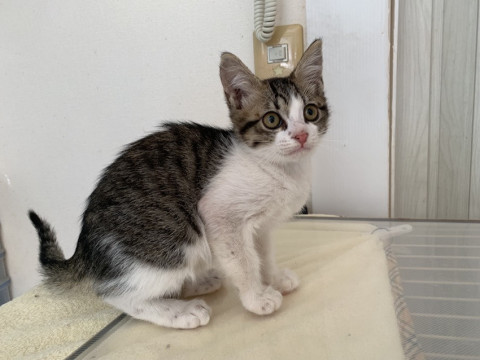 可愛いキジ白、あかねちゃんです。クリクリおめめの美人さん。人馴れも十分でとても人懐こく、一緒に遊ぶのも大好きです。やんちゃで活発、好奇心も旺盛です。たくさんの猫ちゃんと育ったので他の猫ちゃんとも仲良く遊べます。