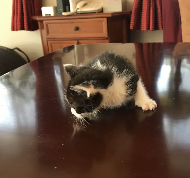 可愛いハチワレでお目目はぱっちりしています。尻尾は長くてスラーとしています。