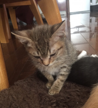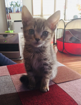 少しグレーがかった縞模様です。綺麗な長い縞模様です。とても慣れ慣れです。猫ちゃんのお友達にもピッタリです。またお留守番も出来ますので、共稼ぎの方にも大丈夫です。