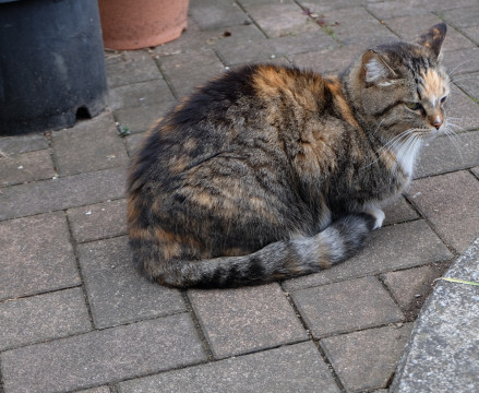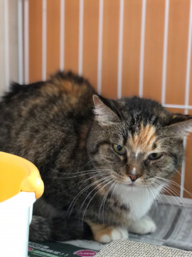 毛色は、キジトラのような、三毛っぽい色合いも見えるような、個性的な毛色です。