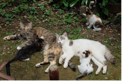 5年前ににゃんこサポート三島がお手伝いをして2匹をTNRしました。夫々子猫を3匹ずつ出産して、子猫は里親さんの下に行きました。5枚目の写真は4年8ヵ月前に子育てをしている時の写真です。