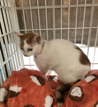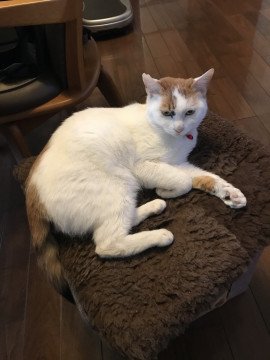 綺麗な白三毛ちやんです。目のホクロがチャーミングです。とってもスタイル良くて尻尾は長くて真っ直ぐです。とっても穏やかでおとなしい三毛ちゃんです、撫でるとゴロゴロ言って甘えます。猫ちゃんのお友達にも1匹でもとても飼いやすい猫ちゃんです。