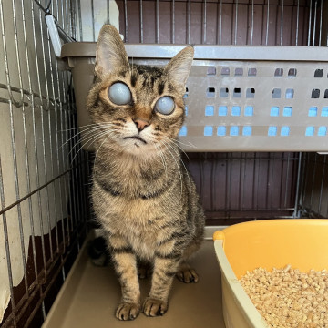 ○角膜混濁で両目が白濁していますが、全く見えないわけではなく、左眼は少しは見えているようです。