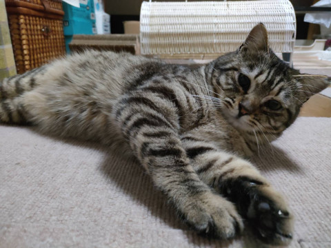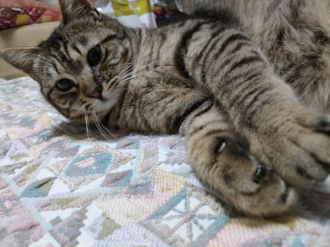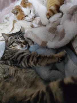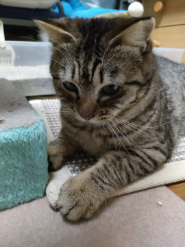 保護する前から人馴れしていて、保護してすぐに先住さんとも仲良くできました。エイズウィルス陽性ですが、激しい喧嘩でもしない限り全く問題ありません。エイズでも普通に生活していけます。可愛い声で甘えて、遊ぶのも大好きな長い尻尾の可愛い性格です。