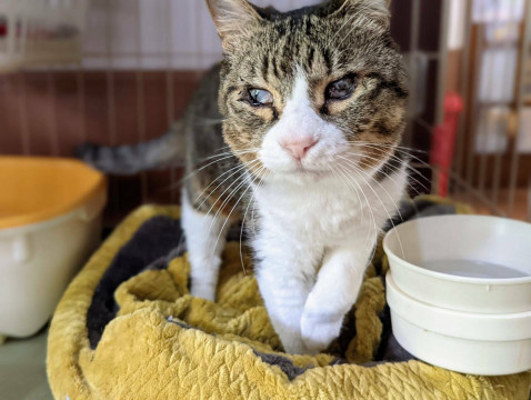 ○小さい頃の結膜炎の影響で目が白濁していますが、目は見えているようです。ご飯もトイレもケージの出入りも自分ででき、生活に問題はありません。