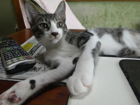 キジ白で可愛い男の子。生後3週間目のころから大事に育てました。何度も具合が悪くなって病院へ行き強食をやったり薬を飲ませたりしたので人馴れは十分、甘えん坊です。猫を初めて飼う人にもおすすめできます。今は体重5kg弱ぐらい。
