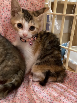 綺麗な三色の三毛ちゃんです。とても穏やかで可愛いです。姉妹2匹でも1匹で飼われても大丈夫です。