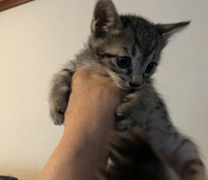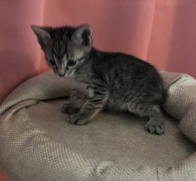 綺麗な模様のキジトラちゃんです。尻尾はカギ尻尾です。お目目はつぶらな瞳で可愛いです。