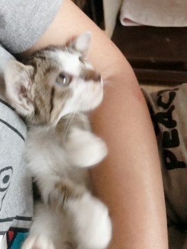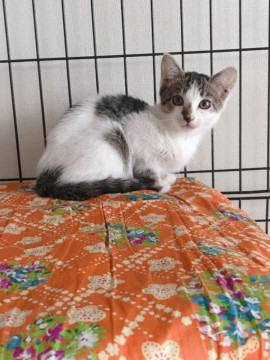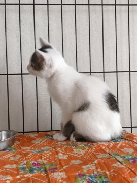 白地にキジ柄模様のある女の子です。元々野良ちゃんが産んだ子で4兄妹でした。他の3匹は知り合いが家族に迎えて下さり、菊ちゃんは初めてのインターネット募集です。尾は長く、ちっちゃくてとても可愛らしい顔をしています。