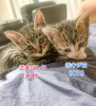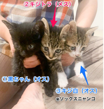 3匹とも、保護当日から元気でパウチから始まり今はカリカリも食べています。