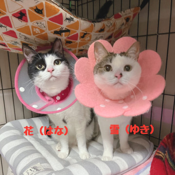 雪ちゃんはキジ白の女の子、花ちゃんは黒白の女の子。まるがお、まんまるお目目、見るからに甘えん坊なお顔がキュートな姉妹です。