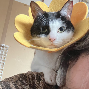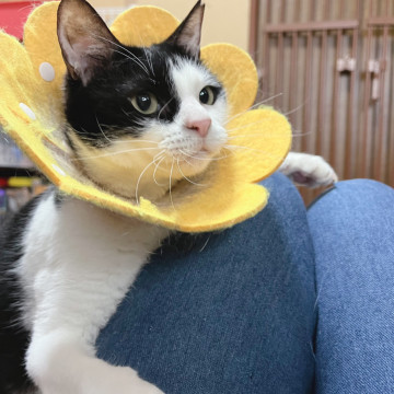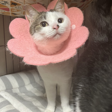 皮膚が弱く、療法食のみをあげていますが、舐めすぎてしまう事があるのでエリザベスカラーを着けている事も多いです。症状が落ち着いていればカラー無しの生活も出来ます。