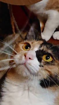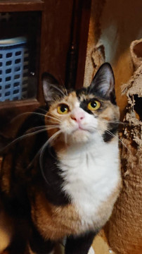 黒ベースのしっぽの長い三毛猫ちゃんです