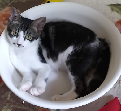 白黒ですが、後ろ足に少しだけ茶色の毛が混ざっています。