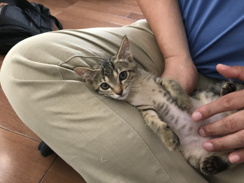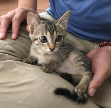 大きな瞳でぱっちりしていています。綺麗な薄いグレー柄のキジトラちゃんです。尻尾は長くて真っ直ぐです。抱っこするとゴロゴロと喜んでいます。