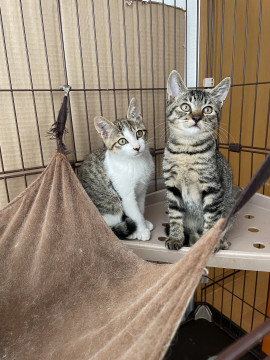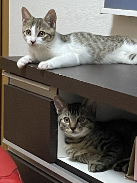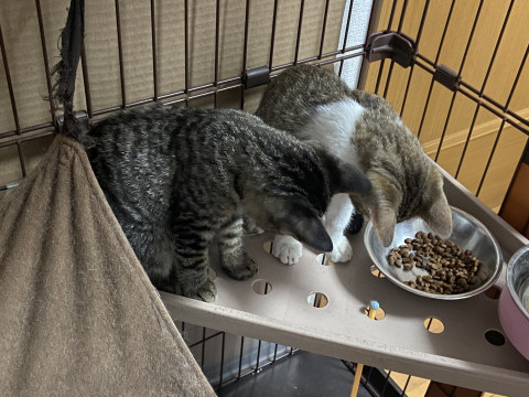 キジ男の子、十和(とわ)君、キジ白男の子、青(あお)君です。2匹共にまだ人をすっかり信用しきれていませんが、攻撃性はなく、撫でる事も出来ますし、人の手からご飯も食べてくれます。このこたちのペースに合わせゆっくり甘えん坊猫ちゃんにして頂けたらと思います