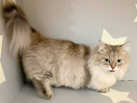 少し臆病なところがありますが、おとなしくマイペースな子です。マンチカンです。