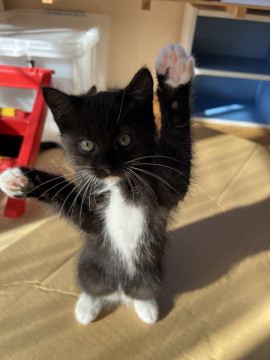アゴが白いです。長女とソックリですが、向かって右の眉毛が白く、手袋が指先だけなのが特徴です。