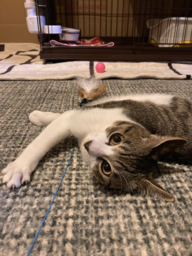 生後2か月ごろから、成猫に追われたり、つつかれたりしてケガをしていたので、個人で保護後、室内飼育をされていました。