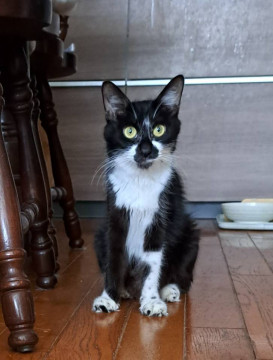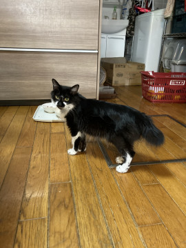 子猫と間違えるほどの小柄さ。目力(目ちから)があり、欲しいおやつなどはしっかり自己主張する。おやつをキャッチする瞬発力がすごい。 人馴れ訓練中で手からフードをたべるようになったところです。