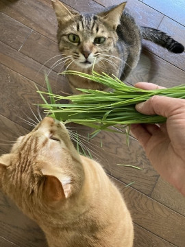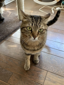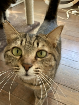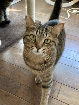 我が家の猫部屋で保護していますが、、、部屋で自由に過ごさせていて、あまり構ってあげる時間が作れないため、いつまでも人馴れ不十分(;^_^A しかしこちらが食事などの世話をしていると、自ら寄ってきて体を撫でさせ、ゴロゴロと喉を鳴らすようになりました。ただ、こちらから近づくと警戒して逃げてしまいます(;^_^A