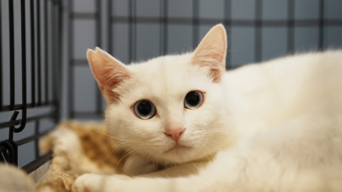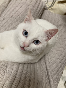 きれいな白い毛と、薄い水色の目が神秘的な猫です。