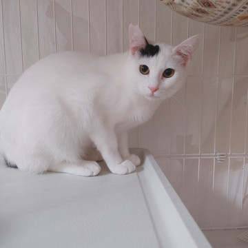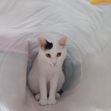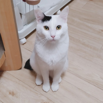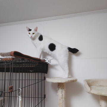 つとむくんは、真っ白なボディに黒ぶち模様のある男の子。標準的な体型で健康です。