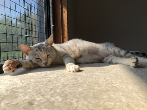 臆病ですが他の保護猫の子達が扉の柵越しに来ても威嚇することは全くなく甘えた声を出すので先住猫さんがいてもうまくやっていける子だと思います!