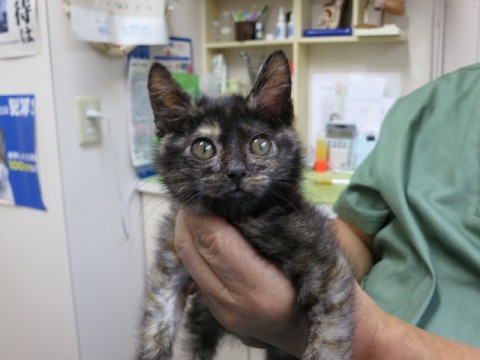 2カ月くらいのサビの女の子です。瀕死の状態で保護され、病院に連れ込まれました。治療の甲斐あって、元気で可愛い姿となりましたので、里親さまを探すこととなりました。家族に迎えてくださる方、お待ちしております。
