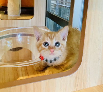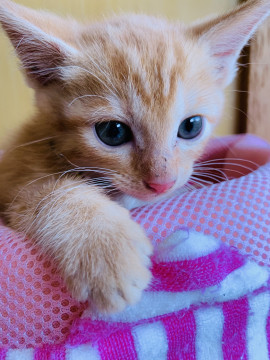 兄妹の中でも1番活発に遊び、楽しそうにプロレスごっこをしたら疲れてコトッと寝る、子猫らしい子猫でとても可愛いです。
