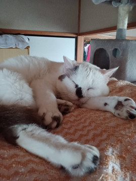 寄ってくる程人懐こいワケではないですが、ナデナデはさせてくれて、ブラッシングが大好きです。投薬も、容易にさせてくれる、穏やかな子。他の猫達にも優しい子です。タコのように体が柔らかいです(笑)