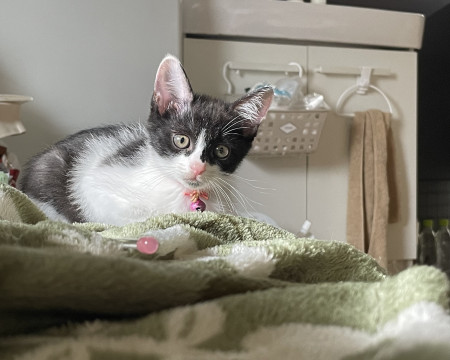 近所でご飯をもらっている猫の子としてうまれ、4匹兄妹で育ちました。兄弟はみな亡くなったり里子に行きひとりぼっちで家族を待っています。おてんばですが、寂しがりやで、おもちゃで遊んでもらうのが大好きです。
