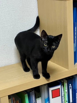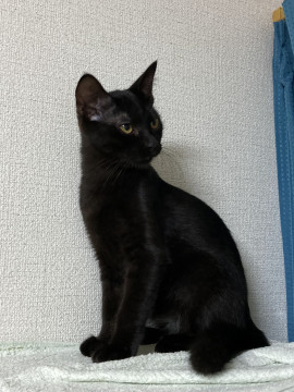 黒猫の子猫です。今のところ短毛です(お母さん黒猫は少し長毛)。もう1匹のキジトラの子猫(シマ)と一緒にとても活発に走り回っています。