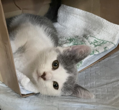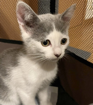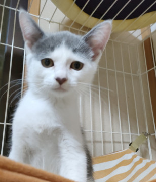 淡いグレーのハチワレちゃんで尻尾は真っ直ぐです。お鼻にハート?模様があります。