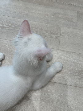 4月21日生まれの真っ白いメス猫ですが、頭に薄い黒い毛が生えています。