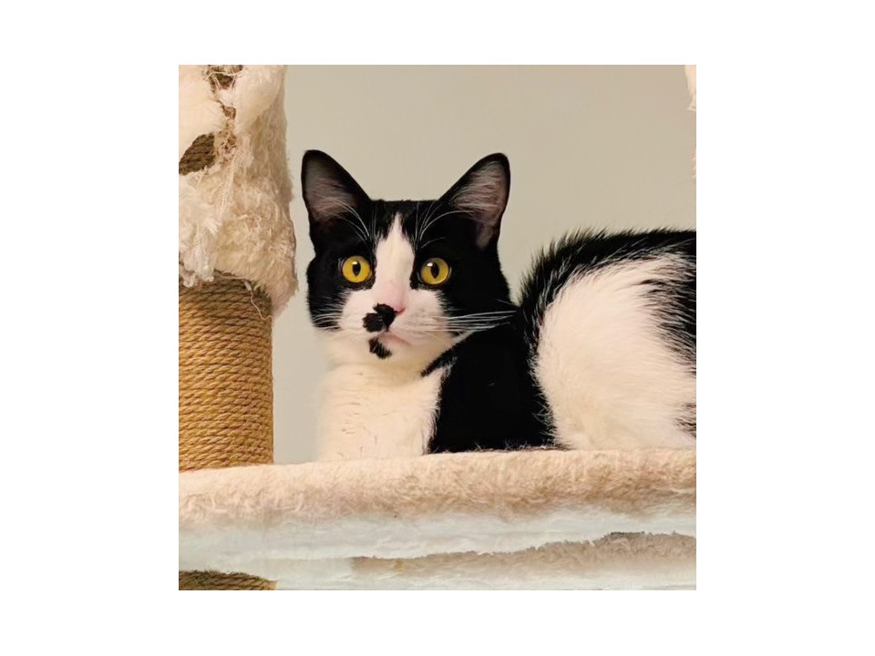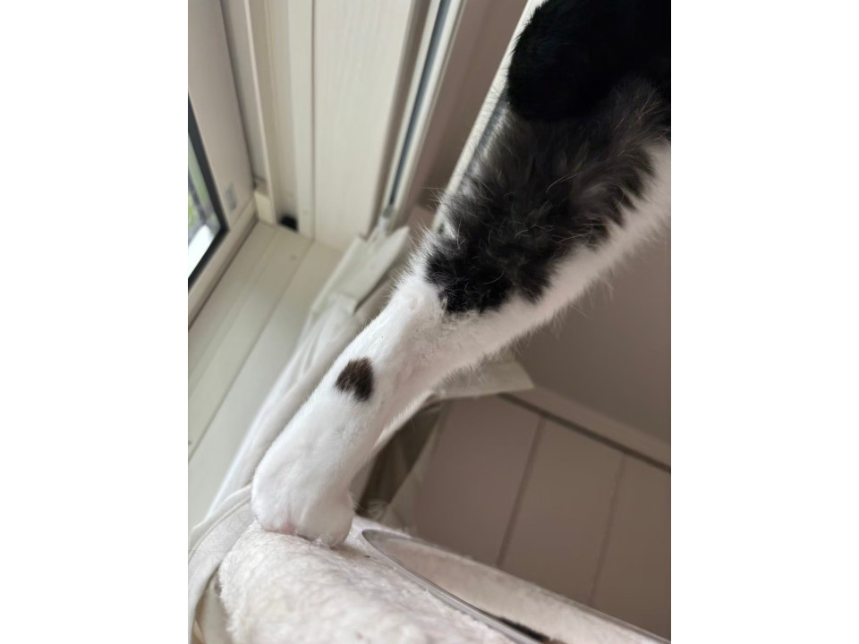 マズル右側にある黒ポッチン模様と左前足の白いハイソックスがチャームポイントです。