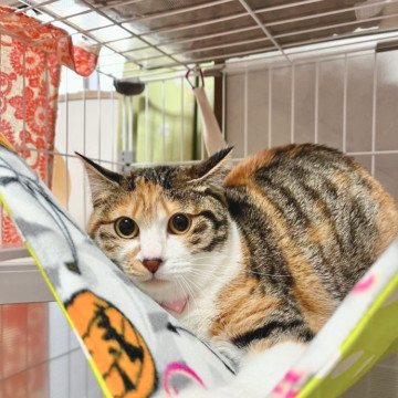 みいちゃんは黒いお鼻がチャームポイントのくっきり縞三毛の女の子。