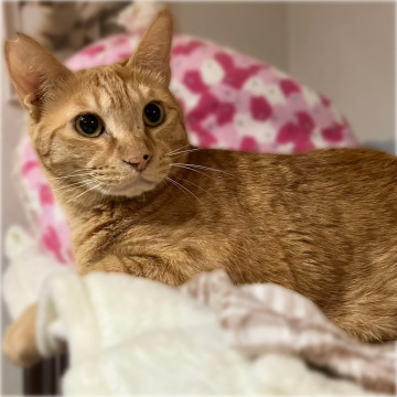 大きくうるっとした目とお鼻の黒い点がチャームポイントの茶トラ男子です。