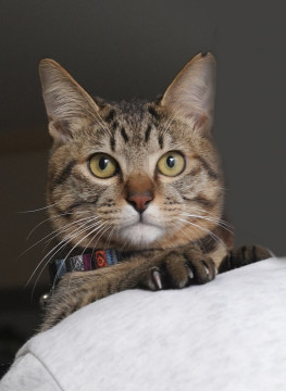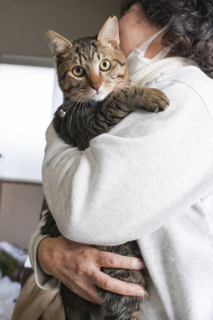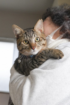 抱っこが大好き。膝・肩・PCに乗ってかまってアピールする、大の甘えん坊です。